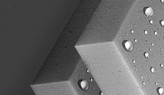 Offenzelliger Melaminharz-Schaumstoff Typ Basotect® mit wasserabweisenden (hydrophob) und ölabweisenden (oleophob) Eigenschaften.